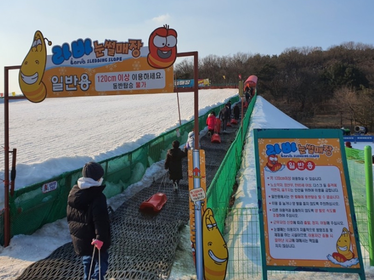 눈썰매장은 일반슬로프(120m)와 유아슬로프(50m)로 나뉘어져 있습니다.