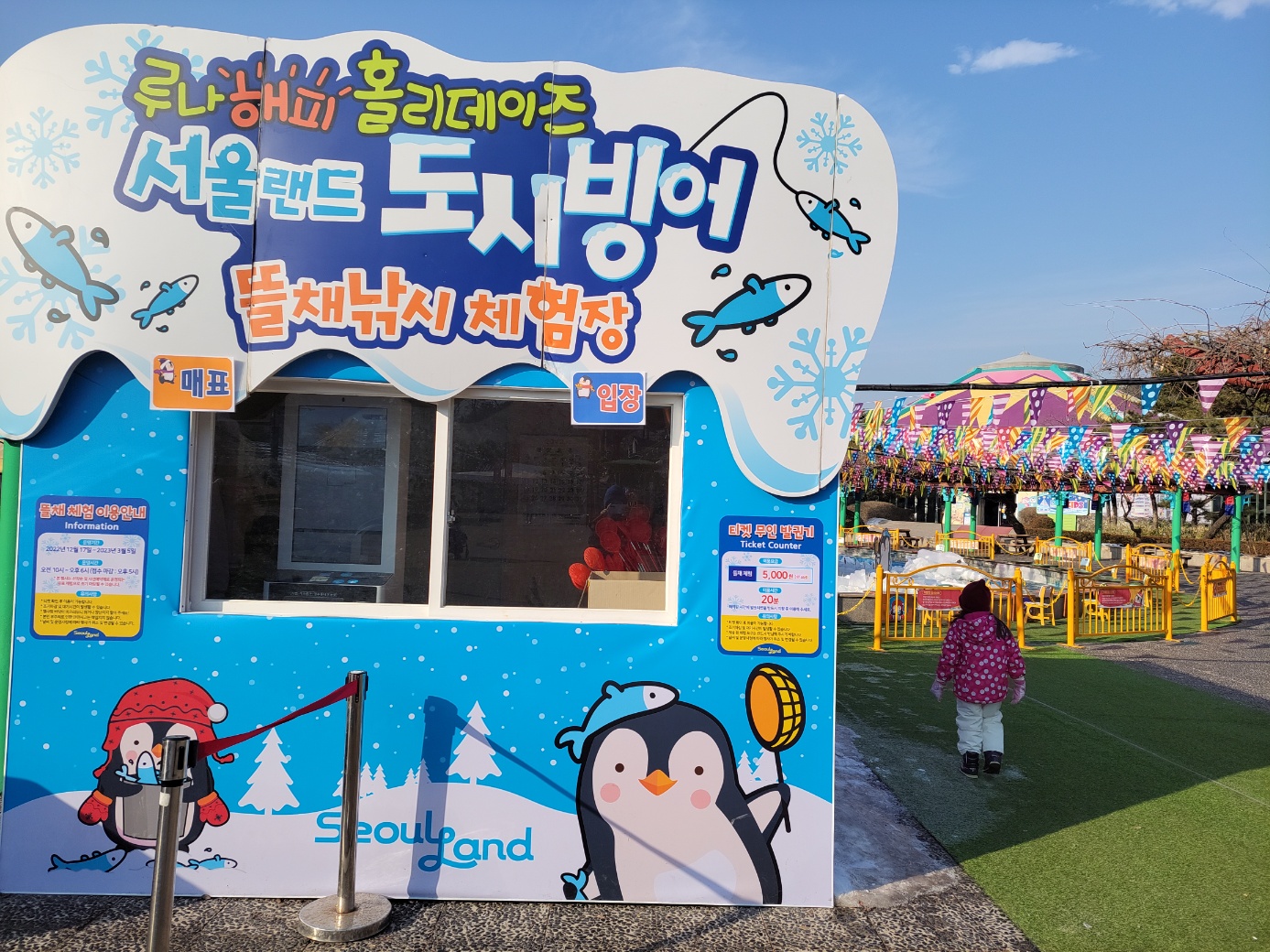 제일 먼저 눈썰매를 타고, 바로 이어져 있는 빙어낚시 체험존에서 놀고, 점심먹은 후 놀이기구를 타는 계획이었어요.