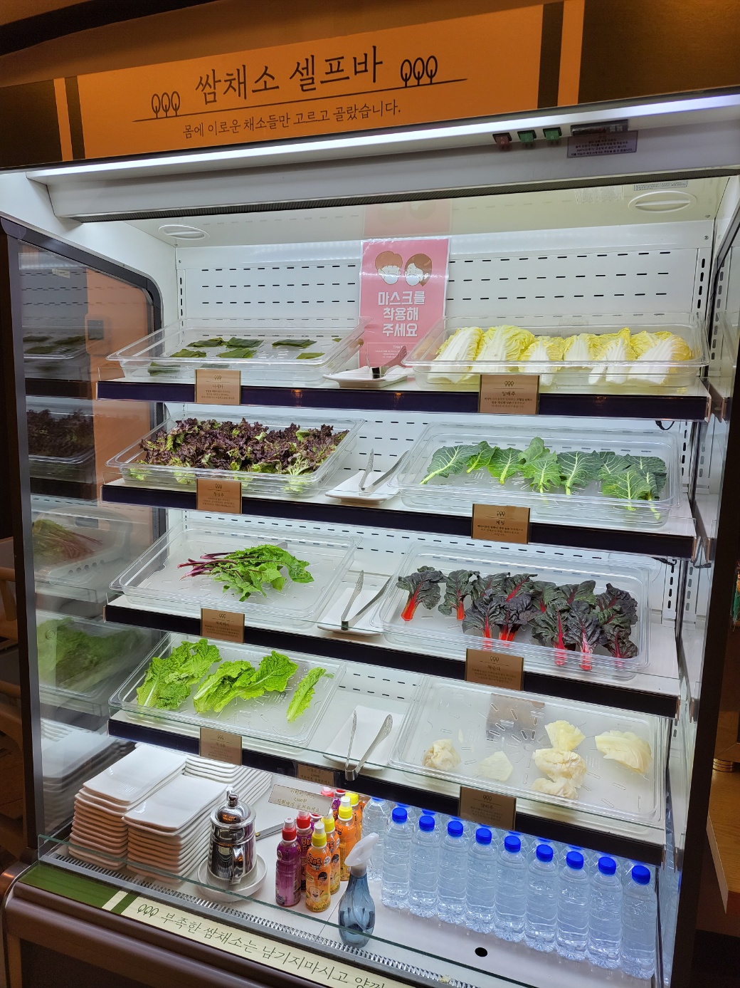 바로 옆에 반찬코너와 쌈채소도 편하게 가져올 수 있습니다. 또, 물도 깔끔하게 생수통에 비치되어 있습니다.