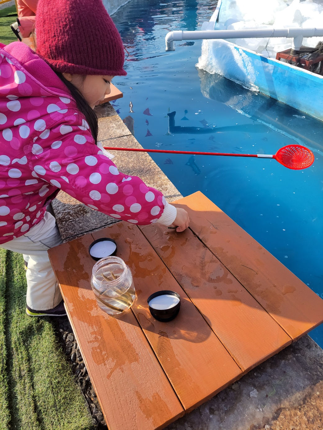 조그마한 뜰채로 요리조리 피해가는 빙어를 건지는 건 쉽지 않았어요.